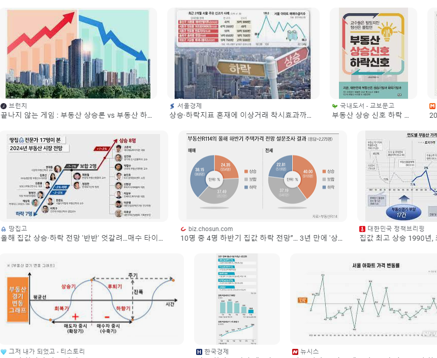 - 반면에 집값이 상승할 것이라고 보는 사람들은 부동산에 장기적인 투자 관점을 갖고 있으며, 금리 인하와 규제 완화에 대한 기대감이 크다.