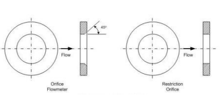 일반적으로 오리피스 유량계는 중간에 구멍이 있는 판 모양을 하고 있습니다. 위의 그림. 2은 오리피스 유량계의 형상과 제한 오리피스의 일반적인 형태이며, 차이점은 두 번째 오리피스의 구멍 프로파일에 차이가 있습니다. 오리피스 유량계는 일반적으로 첫 번째 피트에 대한 프로파일이 직선이지만 그 다음에는 약 45°의 경사로 노치(베벨)가 있습니다. 제한 오리피스 구멍은 직선형 프로파일을 가지고 있습니다.