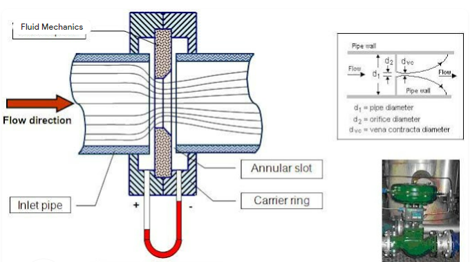 오리피스의 재질은 날카로운 모서리와 표면이 부식 및 침식으로 인해 변형되지 않는 방식으로 선택됩니다. 이것은 파이프에 동심원의 원형 구멍이 있는 얇고 평평한 원형 판입니다. 이것은 두 파이프의 플랜지에 볼트로 고정됩니다. 사각 모서리(90°) 오리피스는 양방향 흐름을 측정하는 데 사용할 수 있습니다. 3.175mm보다 두꺼운 오리피스 플레이트는 유체의 원활한 흐름을 용이하게 하기 위해 다운스트림 가장자리에서 45°로 자주 비스듬히 기울어집니다. 경사진 오리피스는 물론 단방향입니다. 때때로 판이 파이프와 만나는 곳에 배수구 또는 통풍구가 제공되어 튜브에 가스와 기포가 축적되는 것을 방지합니다. 차동 압력계는 흐름의 상류 및 하류 측 모두에 연결됩니다.