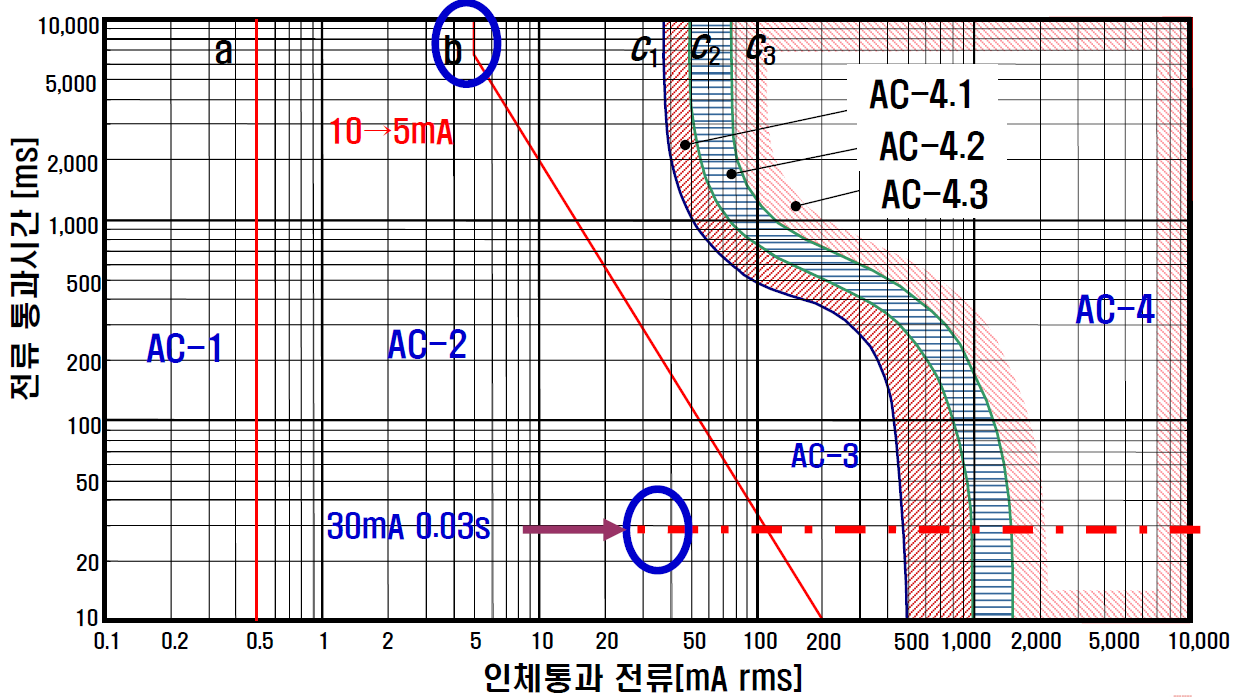 - 상용주파수(60Hz) 교류에서 성인 남자(통전시간이 0.03초인 경우 : 1,000mA, 통전시간이 3초인 경우 : 100mA)